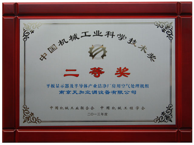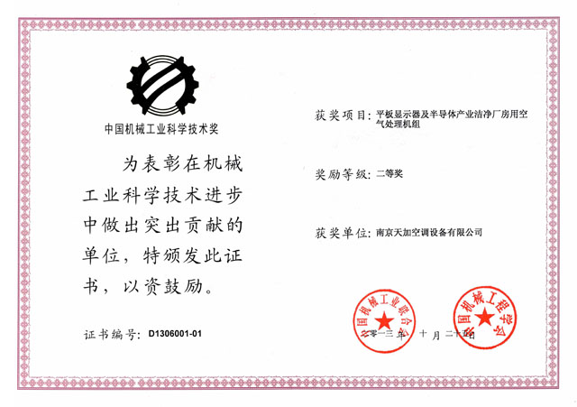 热烈祝贺天加平板显示器及半导体产业洁净厂房用空气处理机组(简称MAU机组)凭借其优秀的专业水准于2013年10月21日荣获2013年中国机械工业科学技术奖二等奖。